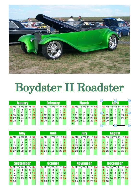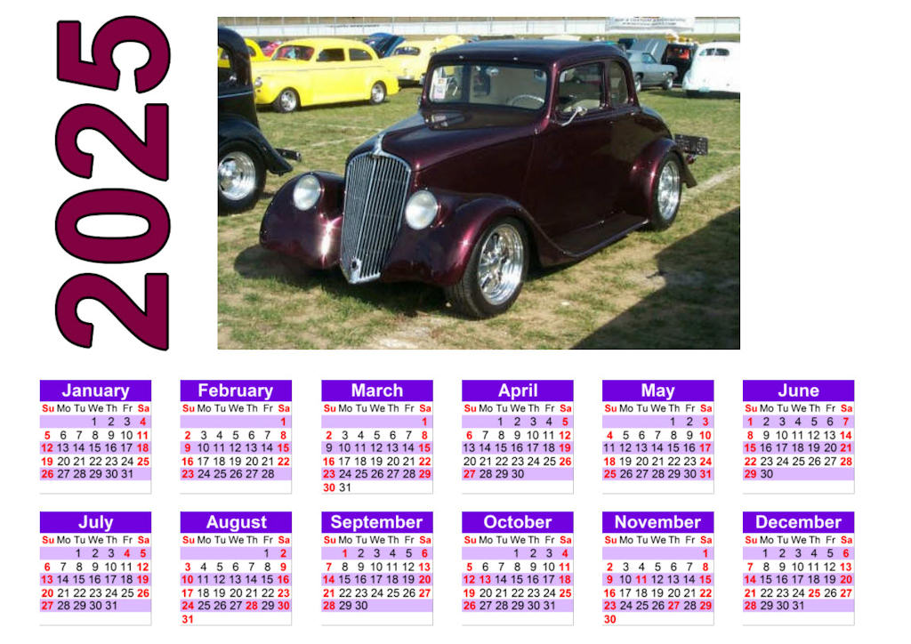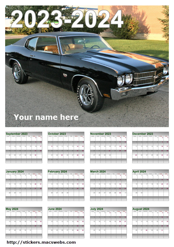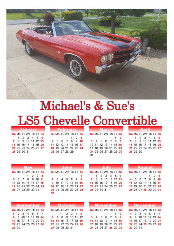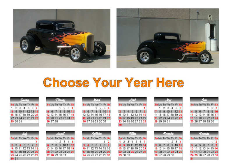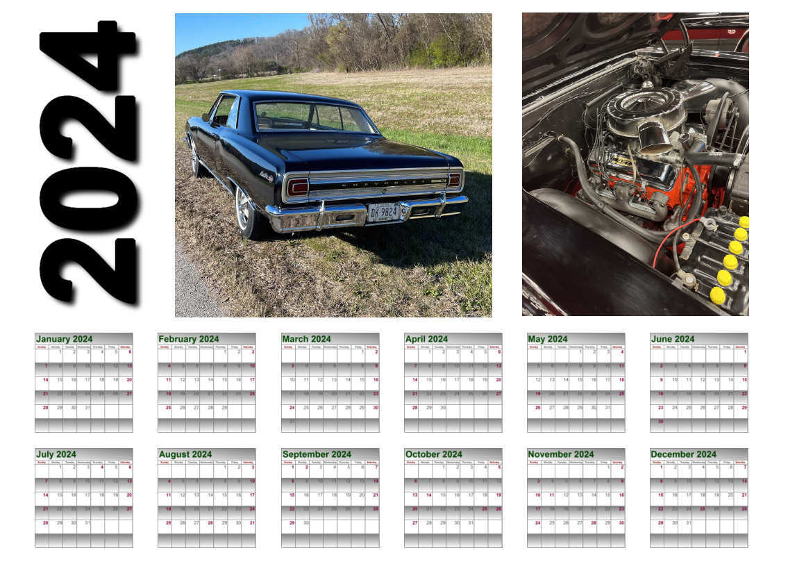 Depending on the photos submitted, up to three (3) can be used. With one photo calendar layout, you can specify to have the current year, your car's model year, or no year overlay on the months. Calendars can start with any month and span 2 years; example start September 2023 and end with August 2024.