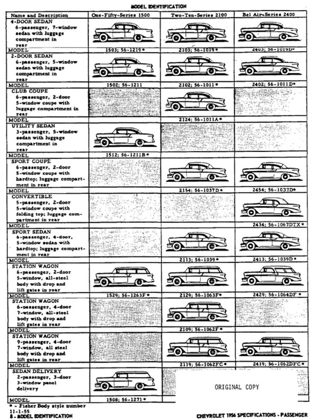 | Series (8-cylinder) | VA - One-Fifty except 1508 VB - Two-Ten VC - Bel Air VD - Sedan Delivery |