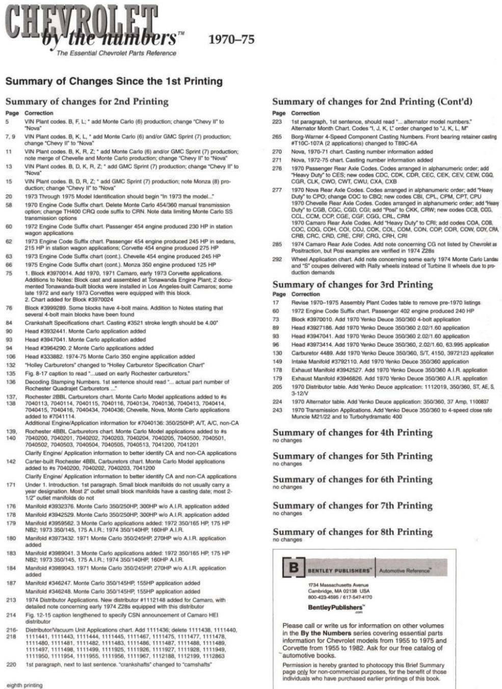 Alan Colvin's Chevrolet by the numbers Errata Links - 1970-1975